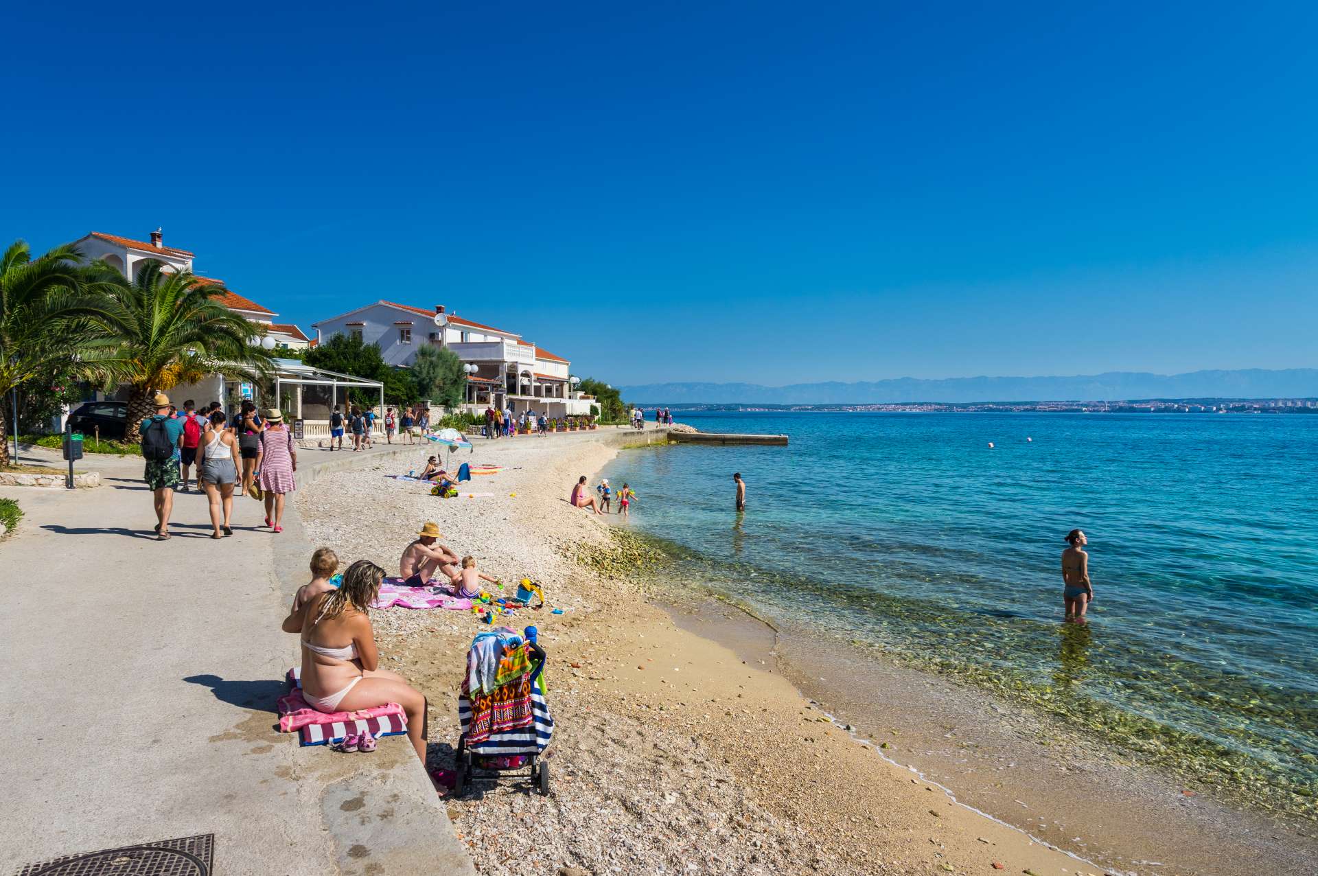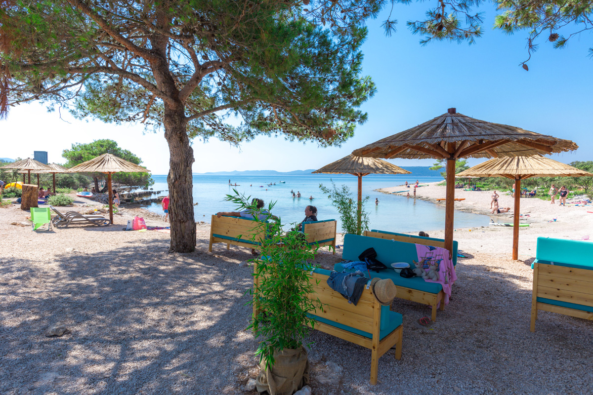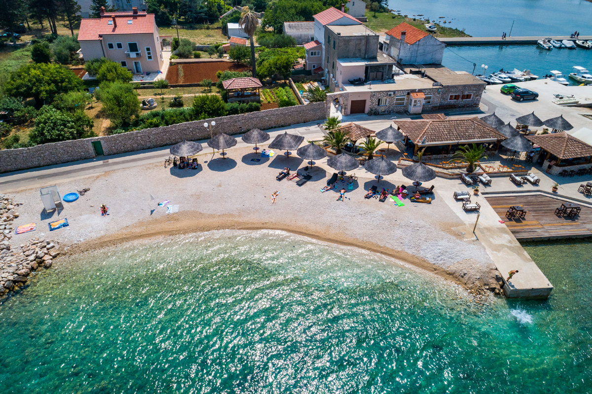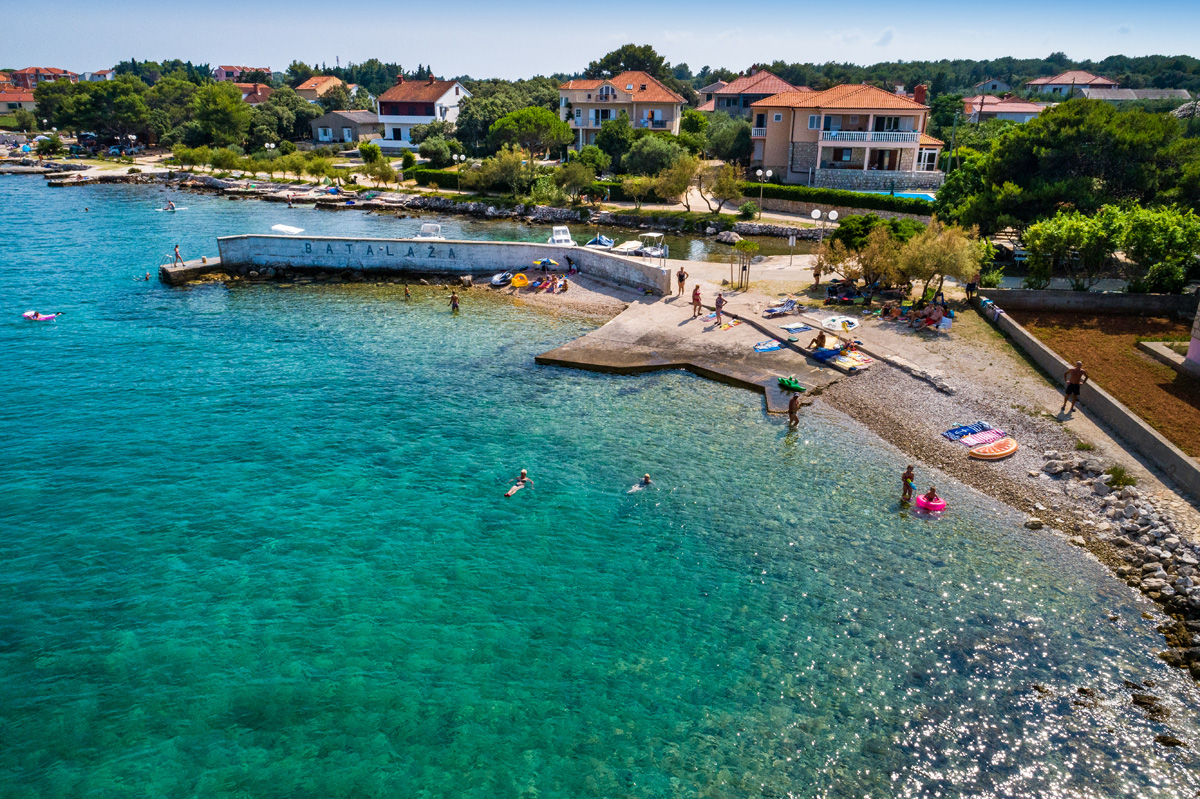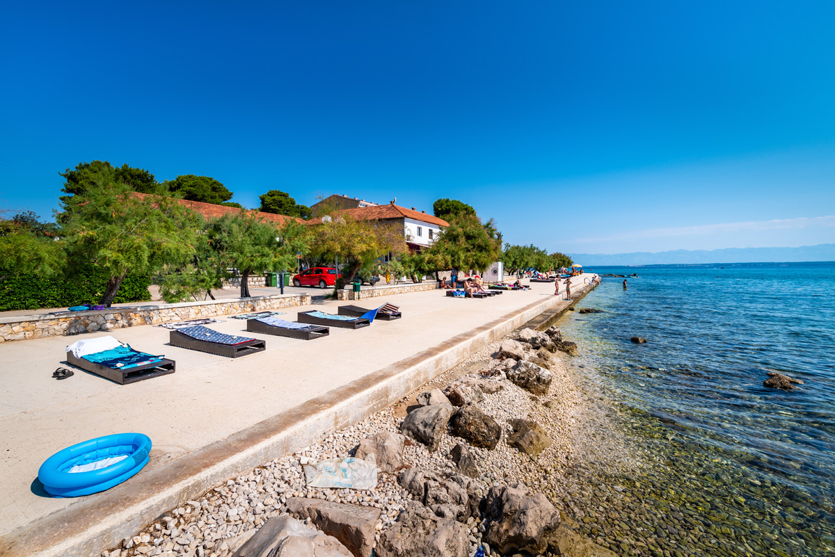 Beach Jaz is the main beach in Preko. It is a sandy beach, the sea is shallow and children can have carefree fun in the shallows. In addition, the beach has slides for children, catering facilities (restaurant, pizzeria), toilets and a parking lot. Next to the beach there is a children’s park, a volleyball court and a promenade for peaceful and romantic walks in the sunset.
