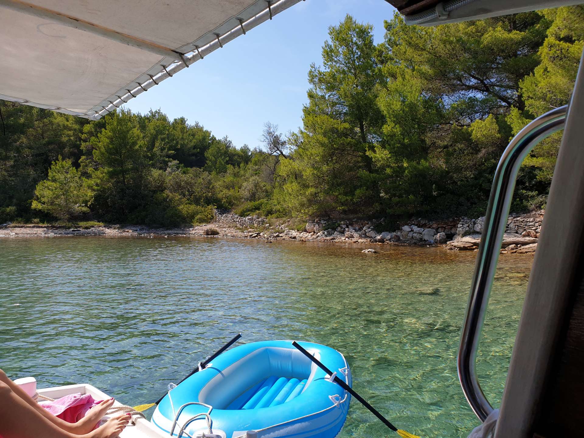 The cove is surrounded by cliffs and unusually blue sky, suitable for boat excursions and enjoying the quietness, sea and pine tree odor.