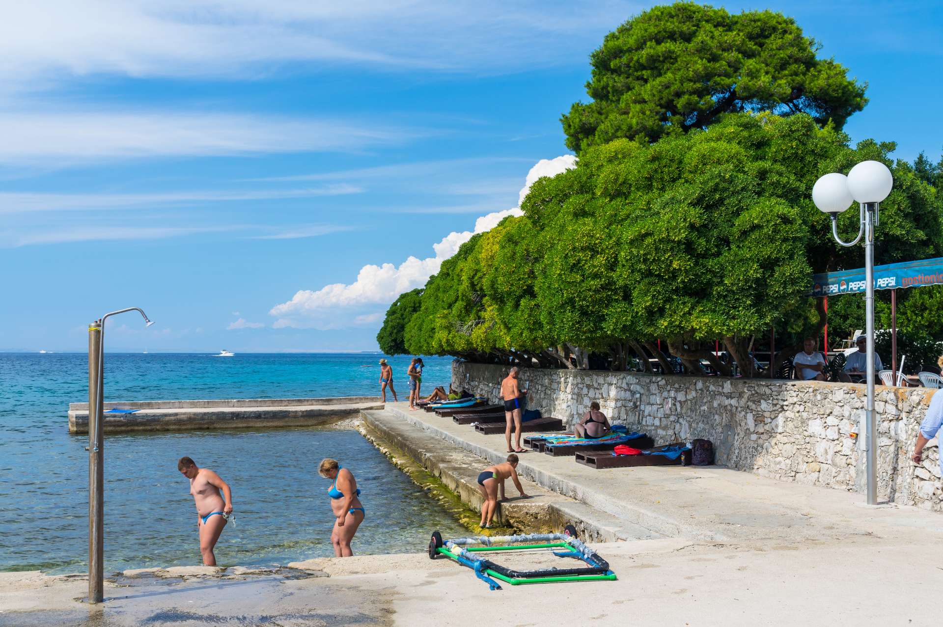 Concrete beach in the center of Ugljan. The beach is equipped with deck chairs, shower and changing cabin.