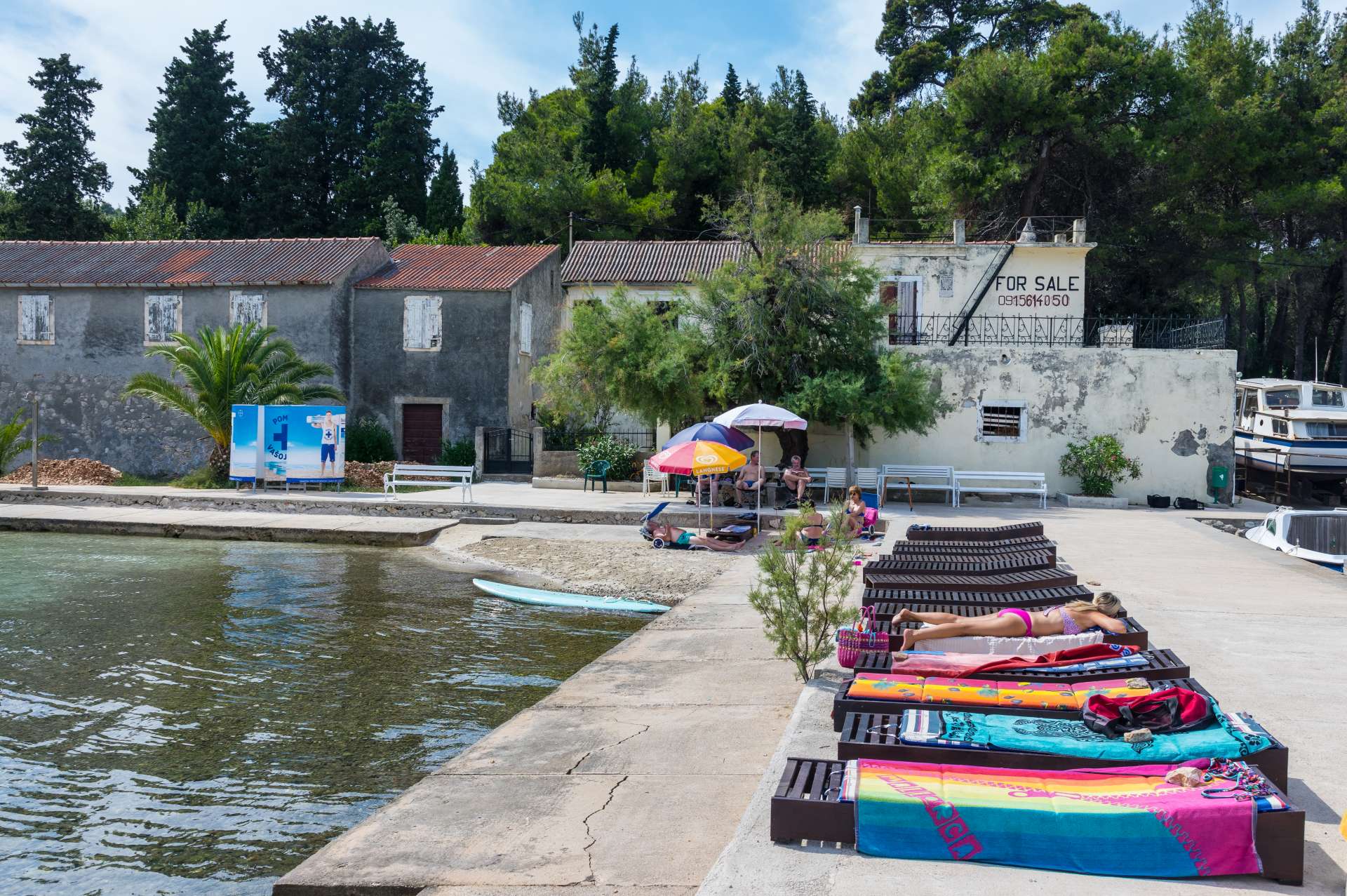 Paved beach in the centre of Mali Lukoran with several easy entrances to the sea with deck chairs, a changing room and a shower. The beach is located below the summer residence of the De Ponte family, and the great Croatian poet Petar Preradović, when dwelling there, wrote the famous Croatian patriotic poem “Dawn is Breaking, Day will Come” (“Zora puca, bit će dana”).