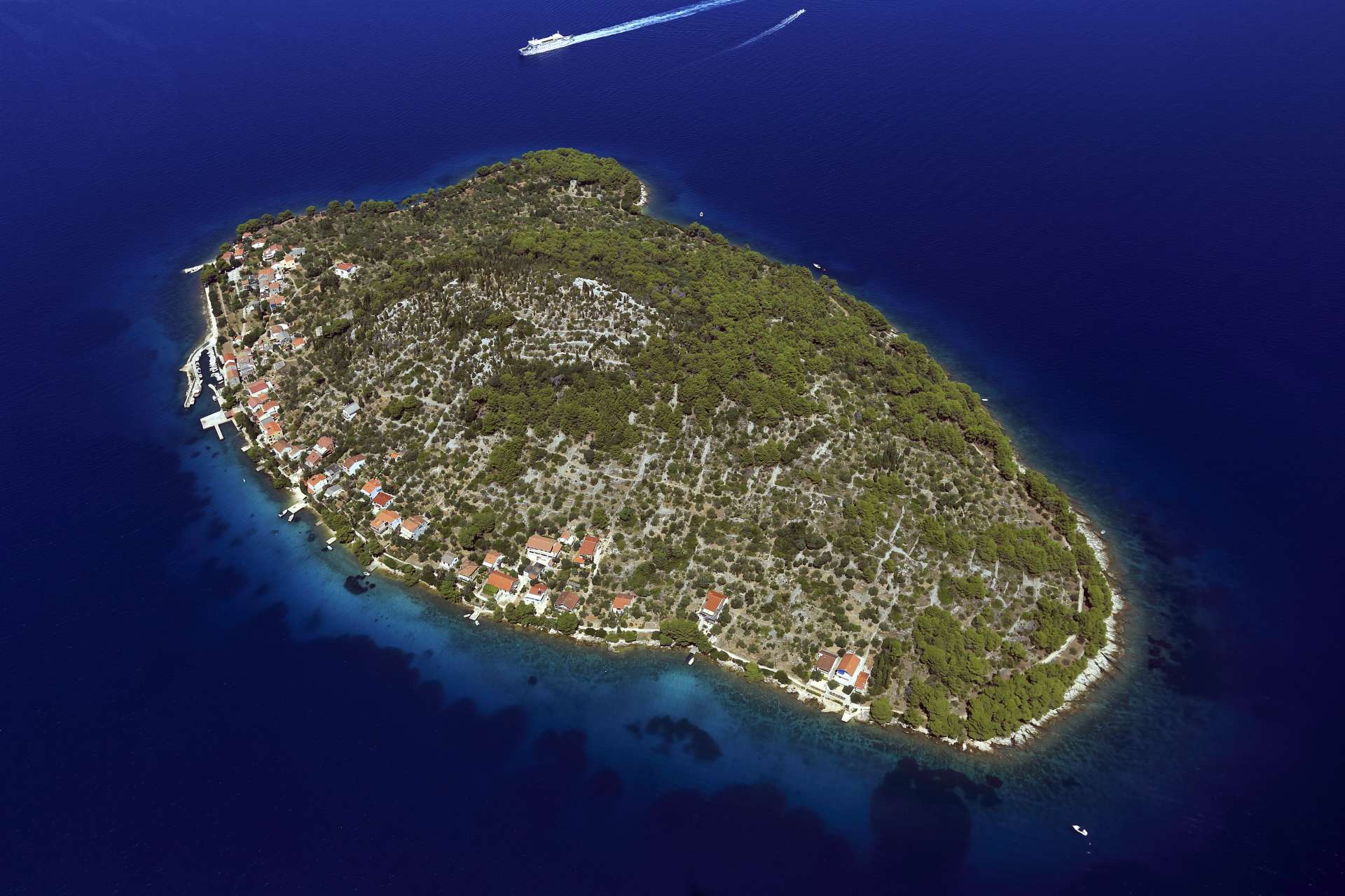 This ever-green island, covered with olive groves, with idyllic bays and picturesque small fishing ports, for generations has been tied to the sea, seafaring and fishing, and more than 2000 years of olive cultivation have left thousands of olive trees yielding oil of exceptional quality and aroma. The other side of the island is mostly steep and uninhabited. Due to the accompanying bays, islands and rich undersea, it is a real challenge for divers and sport fishermen. The undulating plateau in the interior of the island is streaked with tens of kilometres of hiking and biking trails, and the colours, scents and panorama are an unforgettable picture for every passer-by.