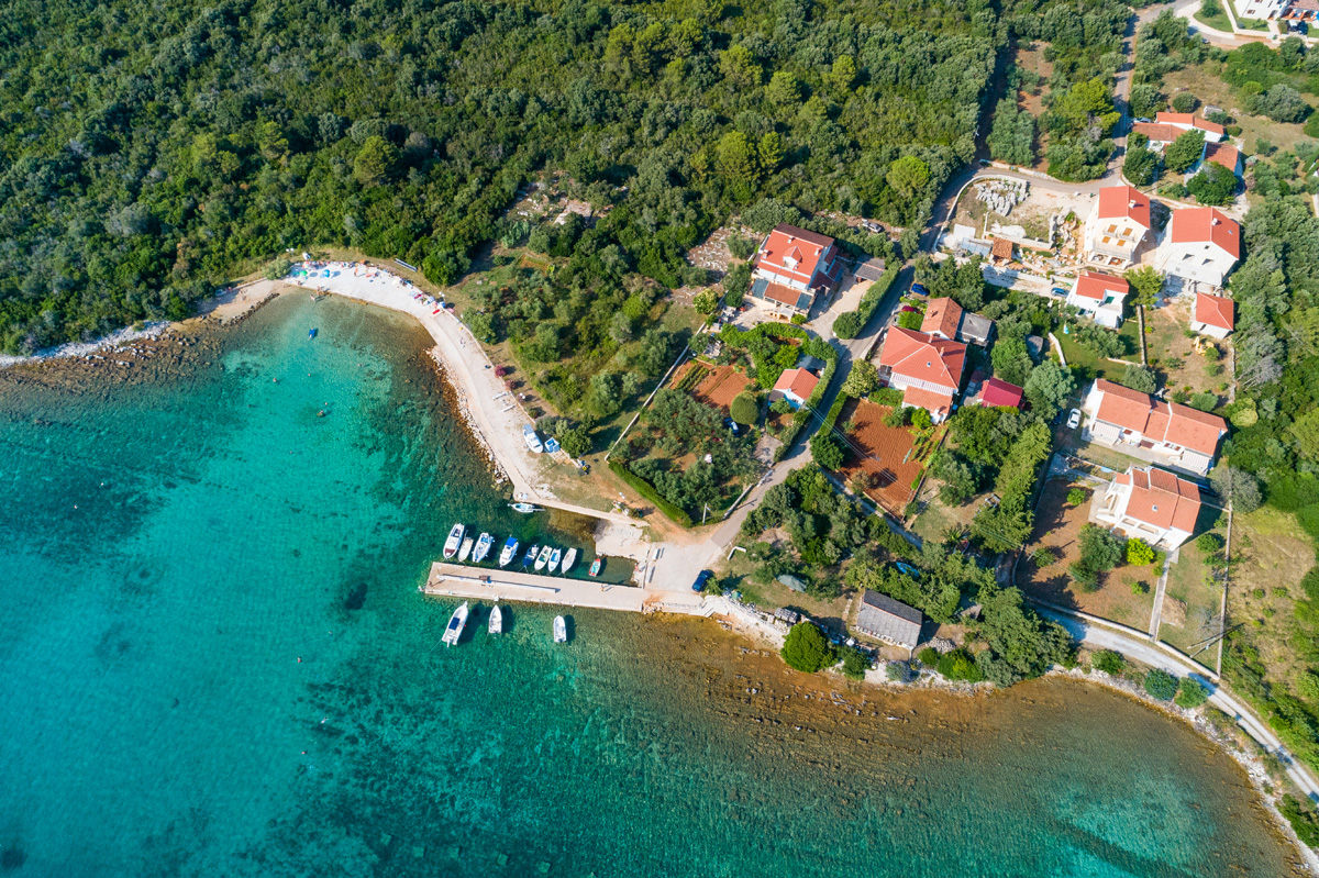 Bay Hrvatinj on the north side of the island. Quiet bay with small berths for boats, surrounded by greenery of pines, cypress trees and other vegetation, suitable for fans of peaceful holidays in the nature. Near the beach there is a parking lot, and since 2018 the bay is adorned with a unique mosaic bench, the work of the artist Božica Kliman.